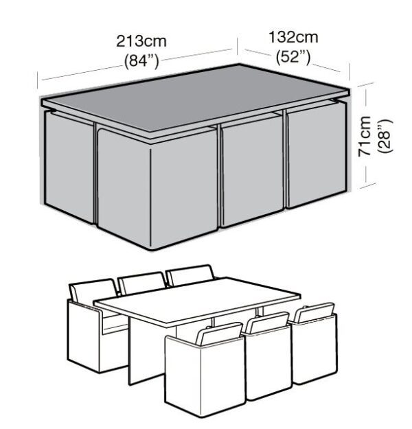 Size Check: 213cm (84″) Long 132cm (52″) Wide 71cm (28″) High Also Covers: Large Rectangular Table